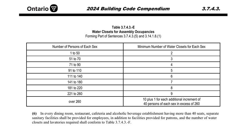 The Building Code Act, 1992, S.O. 1992, c. 23 and O. Reg. 163/24 specify the minimum number of washrooms (water closets) for assembly occupancies, including the use of buildings or part of a building by a gathering of persons for civic, political, travel, religious, social, educational, recreational or similar purposes or for the consumption of food or drink. For more information, please refer to Article 3.14.1.8. of O. Reg. 163/24.