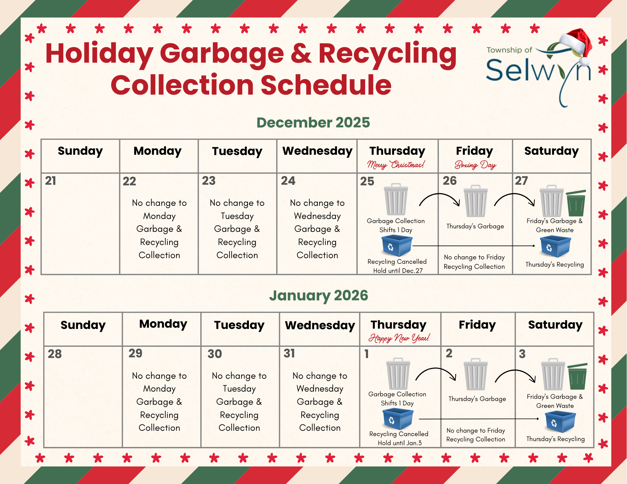 - Friday, December 26th collection moves to Saturday, December 27th (including green waste).