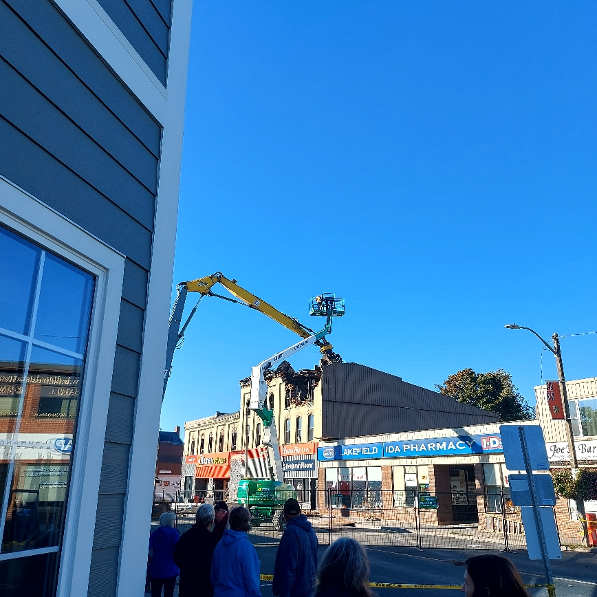 Priestly Demolition Inc. has advised the Township that the work is being completed in a controlled and strategic manner using equipment designed to minimize disruption. Material is being handled with a grappler, which will carefully grab and place debris into bins. Vibration impacts are not expected, and dust will be minimal as the material remains saturated with water from firefighting activities. The demolition is being directed by engineering professionals and supervised by Priestly staff from a boom truck stationed above the work site. The area is fenced off to ensure public safety. For this reason, Queen Street from Albert Street to Reid Street; and Burnham Street from Queen Street to Charlotte Street remain closed.
